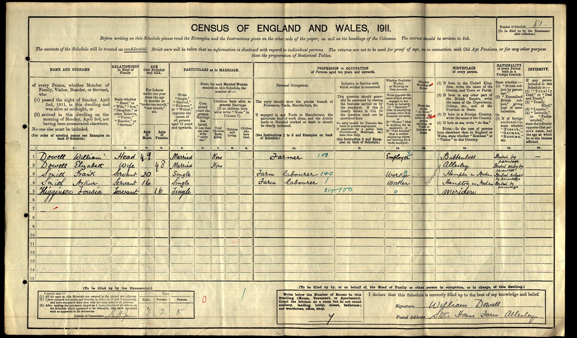 Stonehouse Farm on Google Maps 2019 Our Relations - The Faulconbridges Amanda was not to know but we were aware that we were related to the Faulconbridge Family. Granny Powers (Alice Neal) had an older sister Temperance who married a Faulconbridge. With further help from Amanda we pulled together the family tree. The family pictured outside Stone House Farm were Alfred (b 1893) his wife Mary and children Alfred, Margaret, Luke and Herbert - though better known as Paddy, Joan, Bill and Tim! ![]() Click to see full size family tree then click again to enlarge. Press "Back" to return to this Page Previous Occupants of Stone House Farm In addition, Amanda suppliied a copy of the 1911 census for Stonehouse Farm showing it being occupied by a William Dowell and his wife Elizabeth. Previous censuses show William's father Thomas Dowell at the farm, along with William, from 1891. Prior to that the Dowells were from Bubbenhall. The Dowells were thus the occupants of Stone House Farm for some 25 years prior to Roly and Alice moving there. Click to see full size document then click again to enlarge. Press "Back" to return to this Page