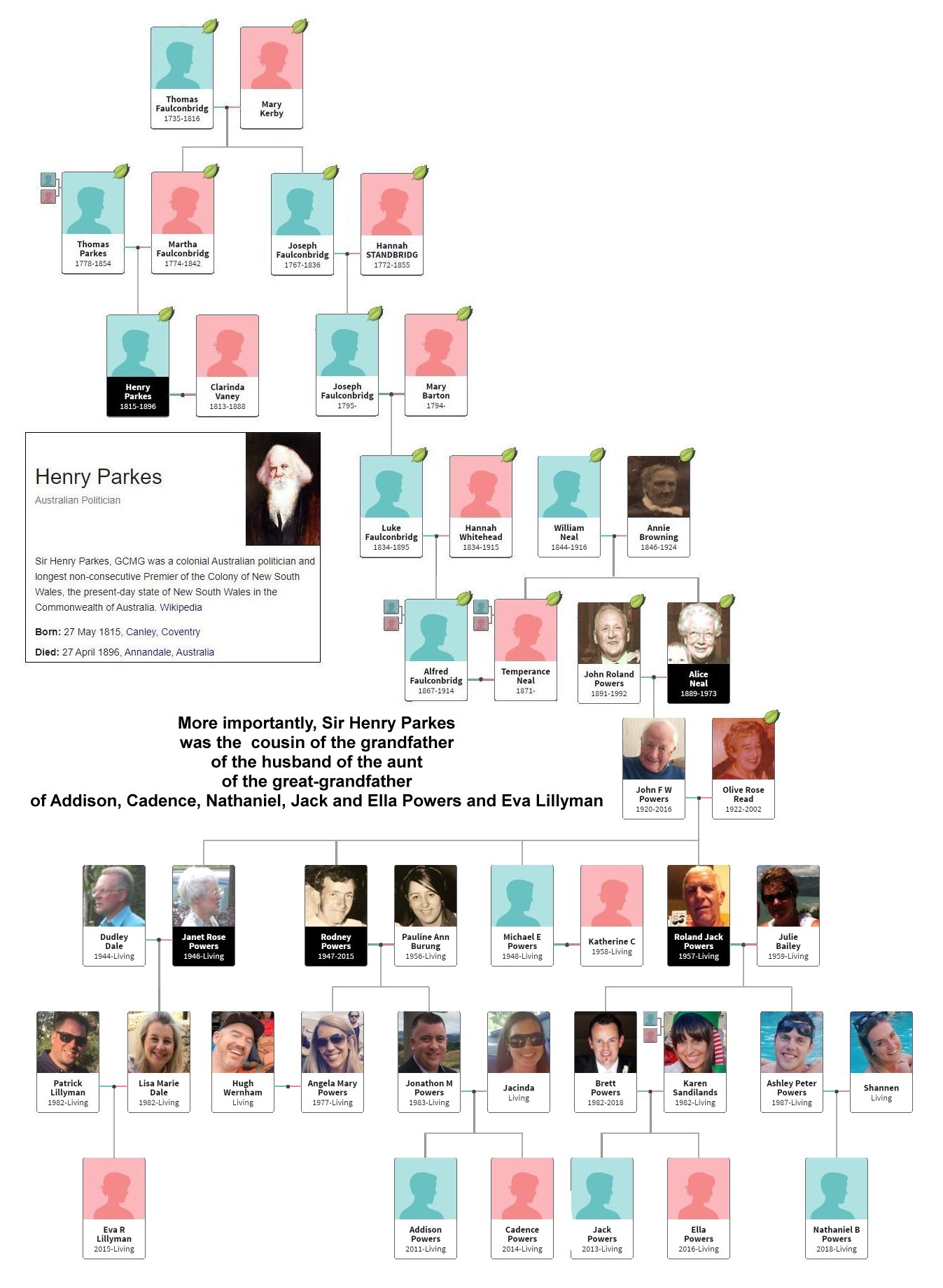 And Finally !! We found out we are, through the Faulconbridges, related to arguably the foremost ever Australian politician, Sir Henry Parkes! Which is gratifying as most of the other family members who emigrated to Australia in those days went out in the convict ships! :)